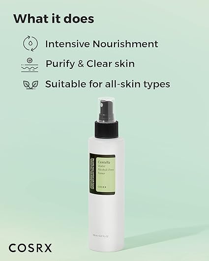 تونر آبرسان و تسکین دهنده بدون الکل Centella Water کوزارکس تونرها جزو محصولات موثر و پرکاربرد در روتین پوست به شمار می روند. یکی از تونرهای عالی که برای همه انواع پوست ها خصوصا پوست حساس طراحی شده، تونر تسکین دهنده فاقد الکل سنتلا واتر برند Cosrx می باشد. این تونر با ترکیبات سازگار با پوست فرموله شده و توسط متخصص پوست تست شده است. در فرمولاسیون آن از مواد مضر تحریک کننده مانند الکل، پارابن، سولفات، فتالات استفاده نشده و کاملا ضد حساسیت است. این تونر در یک بطری اسپری عرضه شده که استفاده از آن آسان باشد. لذا می توانید هر زمان که نیاز به شادابی داشتید، آن را مستقیماً روی صورتتان اسپری کنید.این تونر ضمن آبرسانی فوری و تامین مواد معدنی برای پوست، پاکسازی ملایمی را ارائه داده و تمام ناخالصی های باقیمانده را از بین می برد. در عین حال باعث حفظ تعادل PH پوست شده و آن را برای مراحل بعدی آماده می کند. این تونر همه کاره پوست تحریک شده را تسکین داده و علائم قرمزی را کاهش می دهد. تونر سنتلا واتر کوزارکس فاقد رایحه و عطر مصنوعی است.
